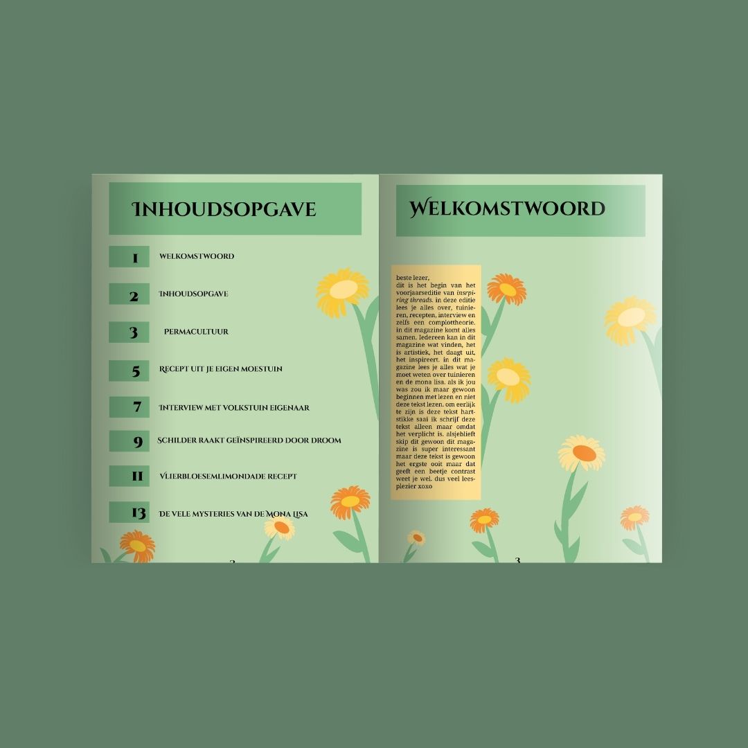 Dit magazine was een schoolopdracht in jaar 3 van mijn MBO opleiding mediavormgeving. We kregen verschillende karakter schetsen te zien, waar we er één van kozen. Hier baseerde we ons hele magazine op. Ik koos Annie, een creatieve vrouw van 50 jaar. ze houd van museums, kunst en heeft haar eigen moestuin.